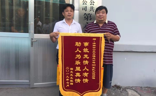7月30日下午,济南“的哥”杨光先生来到济南公交六分公司一队,把一面锦旗送到了车队工作人员手中。杨先生说:“如果不是贵车队510路驾驶员王健及时伸手相助,我这吃饭的‘家伙’怕是都保不住了!”