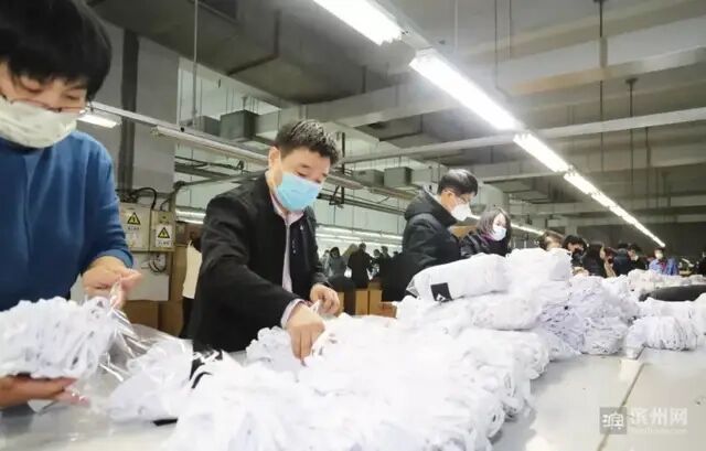 就这样,表姑暂别家中老小,大年初一回到自己的工作岗位上,在党员的带动下,加班加点分两班倒,机器满负荷运转,一摞摞的口罩被生产出来。