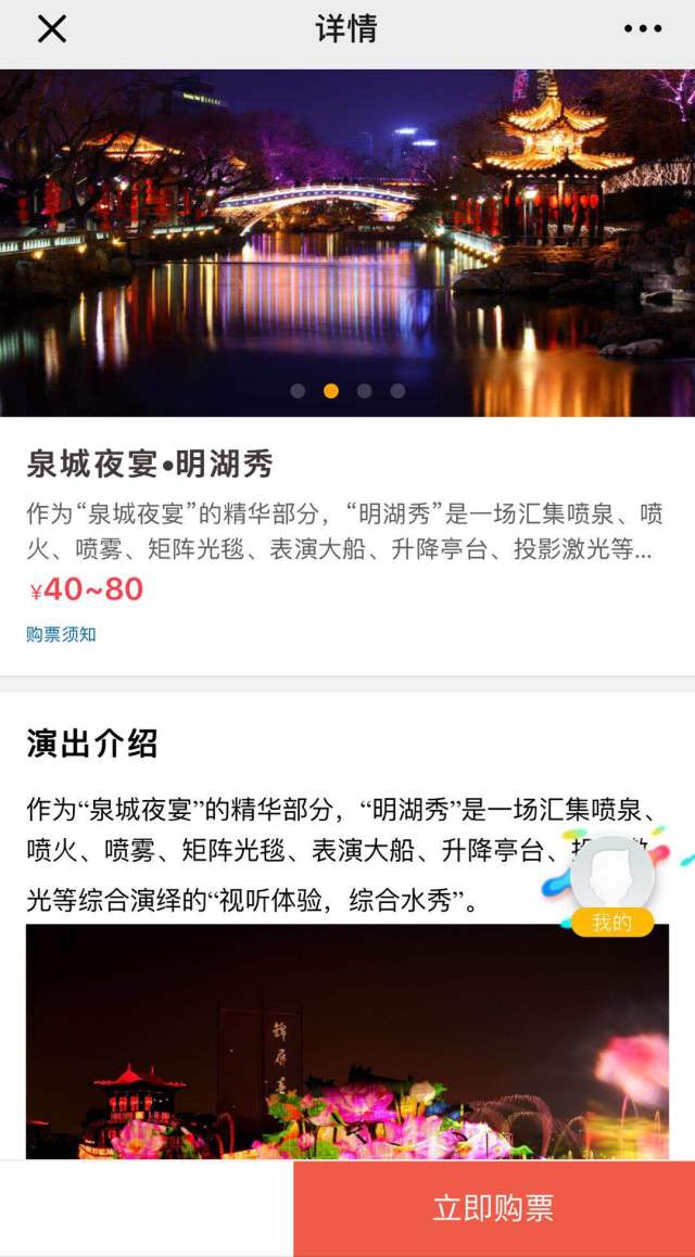 济南文旅集团为促进项目运营发展,组建成立济南文旅集团旅游开发有限公司,根据市委市政府对项目规划设计的初衷和前期公益回馈演出活动的基本情况,为了充分发挥和挖掘项目资源,保证安全有序运行,以及保障项目的健康、可持续发展,依据项目运营成本测算,通过对运营模式的深入研究,决定“泉城夜宴·明湖秀”自2019年4月16日起开始商演。演出地点位于大明湖北岸奇石馆前。