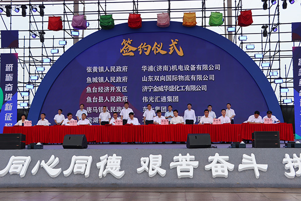 农业农村部市场预警专家委员会秘书长、中国农业科学院信息所农业监测预警团队首席科学家许世卫,中国融通农业发展集团有限公司党委书记、董事长许国成,中国融通农业发展集团有限公司副总经理眭艺,济宁市政府副市长王宏伟,济宁市政协副主席、市工商联主席李克学,山东理工职业学院党委书记许可,济宁市农业农村局局长张洪雷,鱼台县委书记朱贵友等出席开幕式,共同启动“第五届中国•鱼台龙虾节暨首届中国(鱼台)绿色稻米博览会”开幕式;鱼台县委副书记、县长刘学圣致欢迎辞;王宏伟、许国成先后致辞;华浦机电高端装备热处理、鱼城镇惠通物流港、2万吨/年二(三氯甲基)碳酸酯项目及配套氯化氢净化和副产三氯化铁项目、鱼台县文旅产业小镇建设等19个项目进行了现场集中签约;开幕式后,与会领导、嘉宾及客商共同参观了鱼台农展厅、惠河湿地,并出席王庙嘟嘟鱼花园开园仪式。