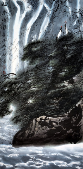 吴先生在笔墨功夫上,还有美的意蕴上面,特别突出。比如他画这个泉水,画松树,画仙鹤,画好多的鹤。我到过西双版纳,我看到过鹤真是站在树顶上的。就是这些在他脑子里形成一种特殊的感受,成为他一种符号的时候,他画松树,画泉水,反复地画。就像李可染先生的国画的特点,吴先生也有几种属于自己这种独特风格、可以作为他的代表性特色的山水的符号,我觉得是独树一帜的。吴先生的画,除了传统功力深厚,还有很强的写生能力。但是另一方面,就是他在传统的功底方面特别有一种中国传统的韵味。李可染先生认为国画达到很高品位就叫有“神韵”,这点我觉得吴先生是很突出的一位。
