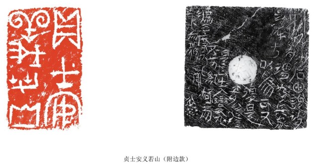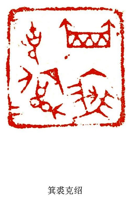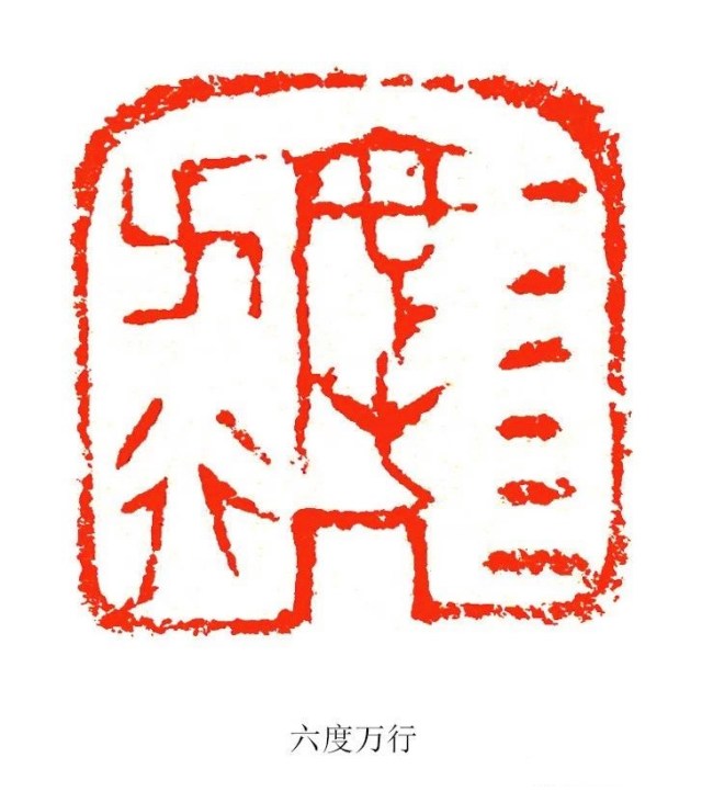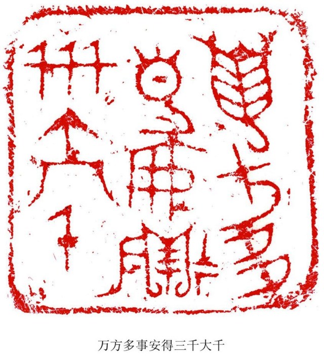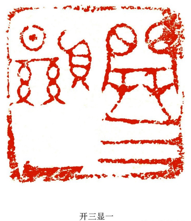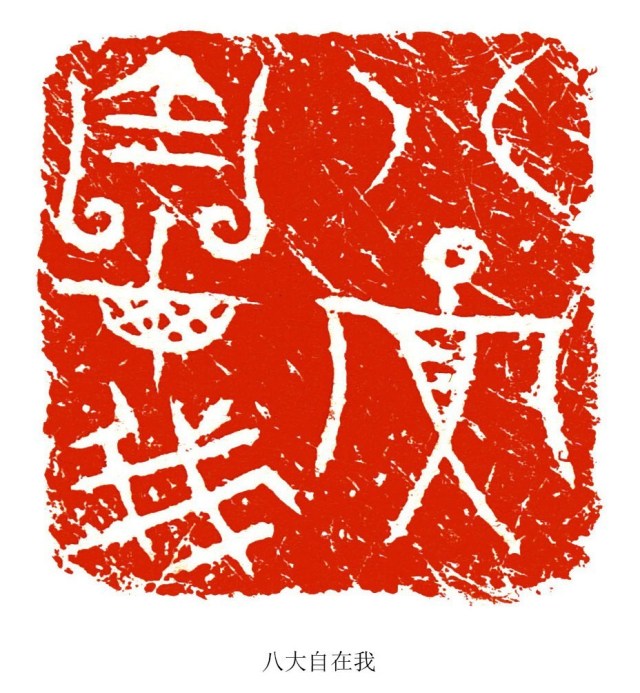 何:是的,将军崖岩画的刻工朴拙,画面简洁,内涵深奥,它的抽象性大于具象性,给人以无限遐想,为我的篆刻提供了一条探索的新途径。在实践中,我适当借鉴吸收岩画中的某些线质与构成特征,淡化篆刻文字形态的主体特征,突出线条划分空间产生的视觉效果。大幅度改变字形的构成,使其充分异化,更具绘画的形式感与装饰意味。在布局上吸收岩画的空间构成,营造出一种更率真、灵动、混沌的篆刻意韵。这样处理的结果,使作品更具个性,具有一定的前卫性、先锋性、实验性,从而更利于情感的传达与抒发。这是将军崖岩画给我的最大启发,是从抽象的画中,抽出元素运用到印章中来,把文字符号化。这点与早期的文字都印证了,早期的文字就是符号。