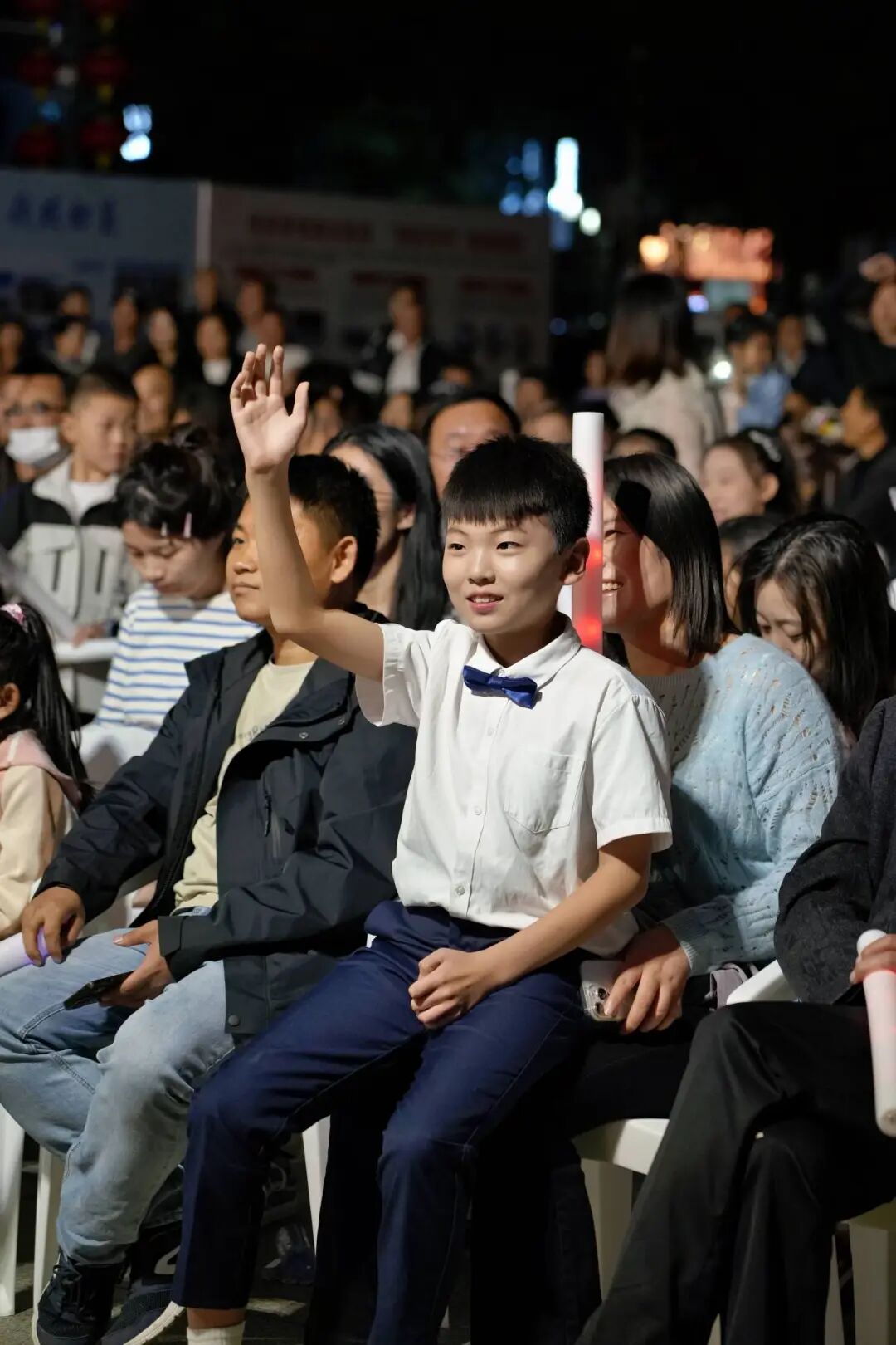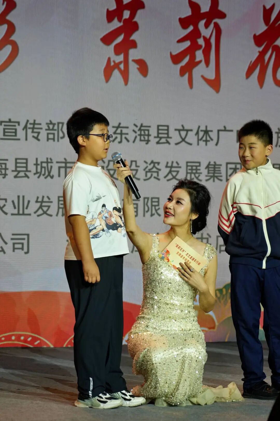演出打破“单向观看”的传统模式,特设的“歌词接龙”互动环节成为全场焦点——8位观众踊跃登台,在经典旋律的接力中展现风采,而参与互动的礼品不仅有全民阅读大礼包、电影票,更有承载着丰收成果美好寓意的东海大米和石梁河大鱼。