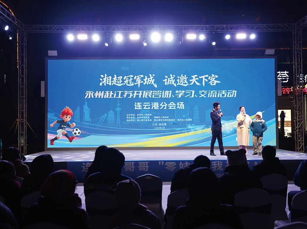 (记者 张晨晨 通讯员 王容 杨福刚)“我这个‘零妹妹’来到这儿,就受到了咱们‘连哥哥’的宠爱呢!”1月16日晚,盐河街中心广场流光溢彩,“湘超冠军城诚邀天下客”永州赴江苏答谢、学习、交流活动(连云港站)在此启幕。来自湘楚大地的永州儿女,跨越千里赴约港城,两位主持人的诙谐互动,更拉近了“潇湘故郡”与“山海港城”的足球之缘。