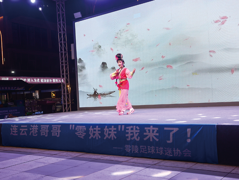 互通互联,离不开文化搭台。零陵花鼓戏团带来的暖场节目《诗画零陵美》,用原汁原味的唱腔勾勒出潇湘美景,随后的《刘海砍樵》《接干妹》等经典剧目串烧,将湘南民俗风情演绎得淋漓尽致。“来连当晚,我们进行了直播,一位本地粉丝看到后,主动提出要为剧团垫付房费,这份无条件的信任太动人了。”花鼓戏团团长黄翠云动情地说。港城文艺工作者也轮番登场,女声独唱《在海一方》婉转悠扬,诉说着山海情怀;民乐《敢问路在何方》奏响西游故里的豪迈,两地艺术碰撞出璀璨的火花。