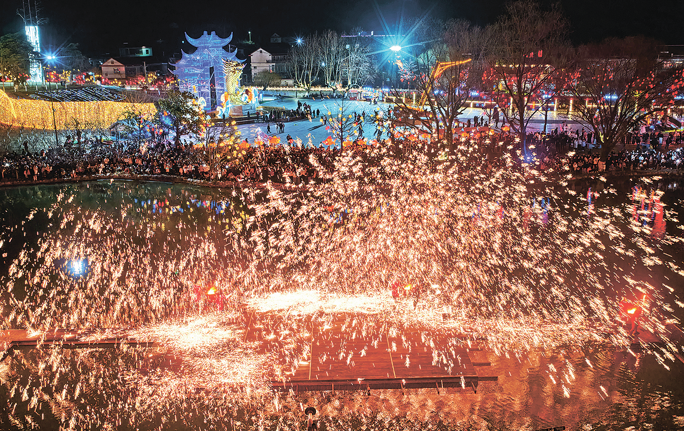 渔湾景区的最大亮点在于创新推出“白+黑”全天候游玩模式。白天踏青手作、挑战溯溪飞拉达、奇幻乐园深海探秘,入夜后好戏才刚刚开场。千年非遗技艺——打铁花民俗表演惊艳亮相,1600℃铁水腾空绽放,星火漫天、气势恢宏,铁树银花落,万点星辰开,让游客近距离感受传统技艺的震撼之美。光影秀、液氮云雾、水力发电互动等科技场景与山水实景相融,增添夜游趣味性。