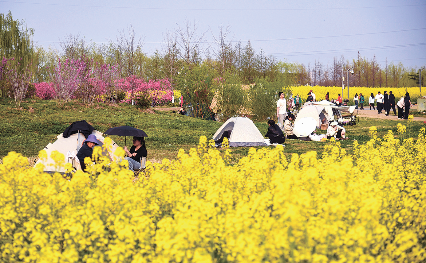 “去月牙岛拍油菜花吧。”72岁的市民老魏在她的姐妹群里呼喊了一声,立刻有3名姐妹响应,4月5日下午,就结伴来到了月牙岛北岛,这里160余亩金灿灿的油菜花田连片铺展,微风拂过,花浪翻滚,香气扑鼻。樱花大道上,粉白樱花如云似雪、缀满枝头,花田周边的草坪上露营帐篷鳞次栉比,大家一边欣赏金色花海,一边享受露营的惬意。知屿寻月探索馆内,孩子们沉浸式参与生态科普研学,了解湿地知识、辨识鸟类;周末农场里,亲子携手体验农耕之乐。赏花、露营、放风筝、喂孔雀,每一项体验都戳中春日心动点,南北双岛各有风情,藏着港城春日的鲜活与浪漫。